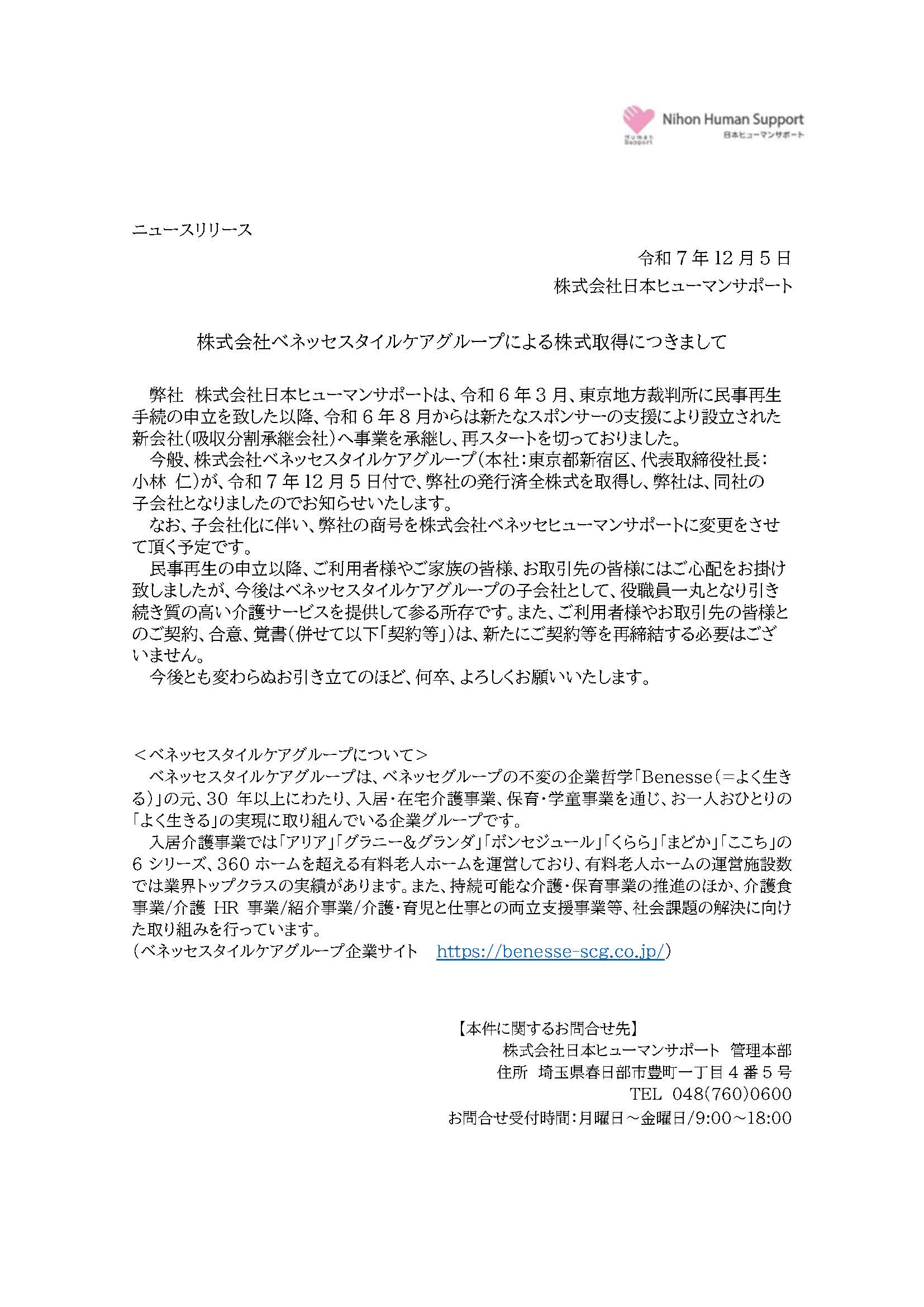 株式会社ベネッセスタイルケアグループによる株式取得につきまして